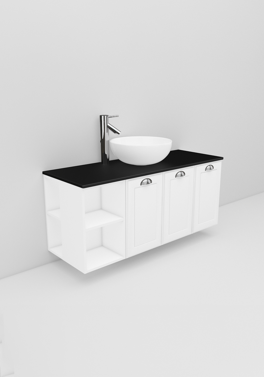 Flexline er badeværelsesmøbler med et tidløst design og mange muligheder. Møblerne fås i varianter med både låger og skuffer med Soft Close-funktion, i bredder på 600 og 1200 mm og med flere forskellige designs på fronterne, som giver karakter til dit møbel. Inkluderer en luksuriøs fritstående vask på en bordplade i Solid Surface-marmor eller sort bordplade. Håndtag, armatur, bundventil og vandlås købes separat.