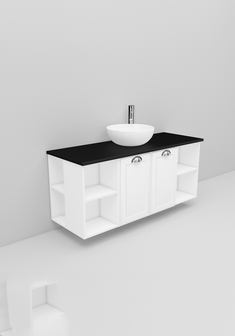 Flexline er badeværelsesmøbler med et tidløst design og mange muligheder. Møblerne fås i varianter med både låger og skuffer med Soft Close-funktion, i bredder på 600 og 1200 mm og med flere forskellige designs på fronterne, som giver karakter til dit møbel. Inkluderer en luksuriøs fritstående vask på en bordplade i Solid Surface-marmor eller sort bordplade. Håndtag, armatur, bundventil og vandlås købes separat.