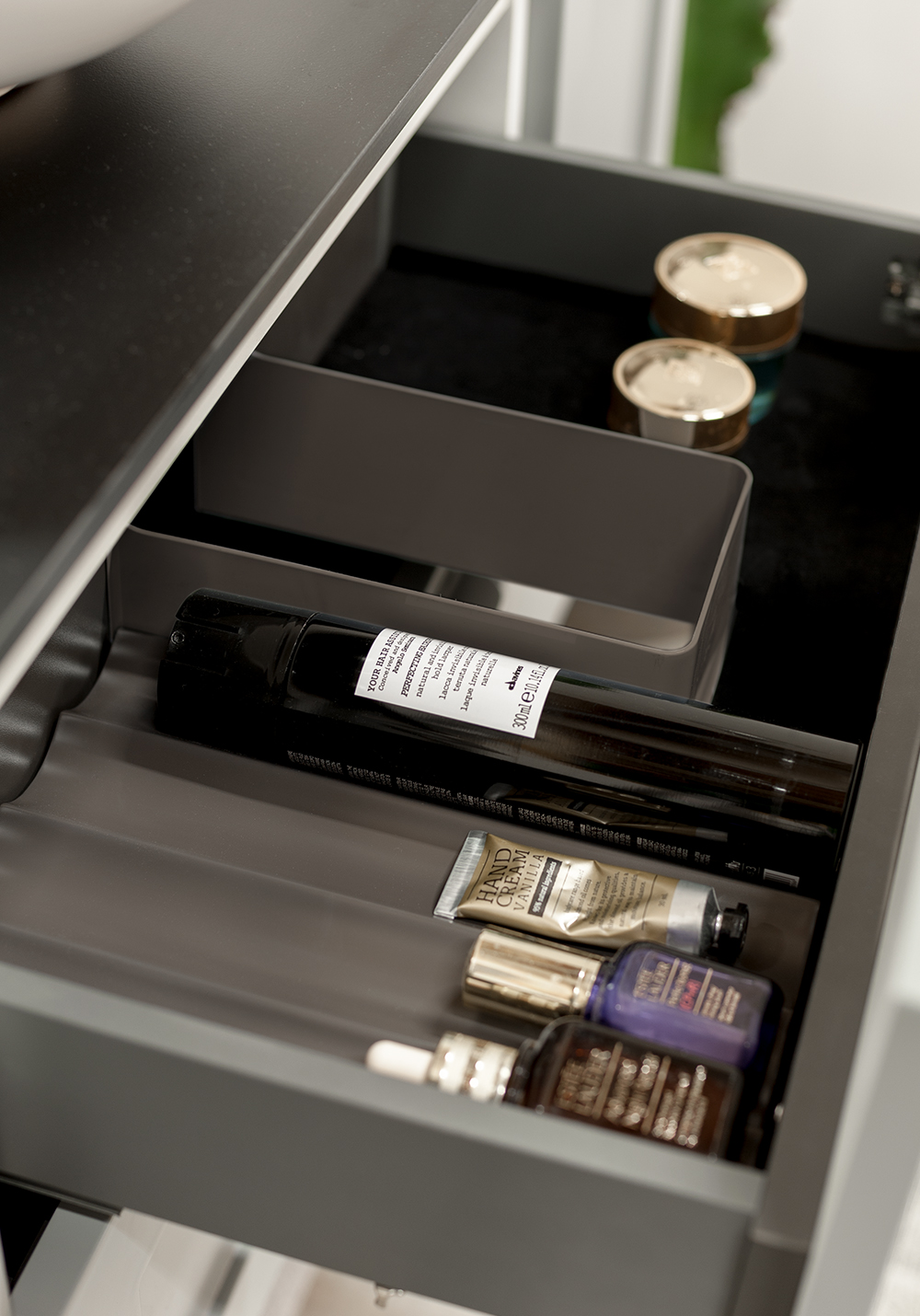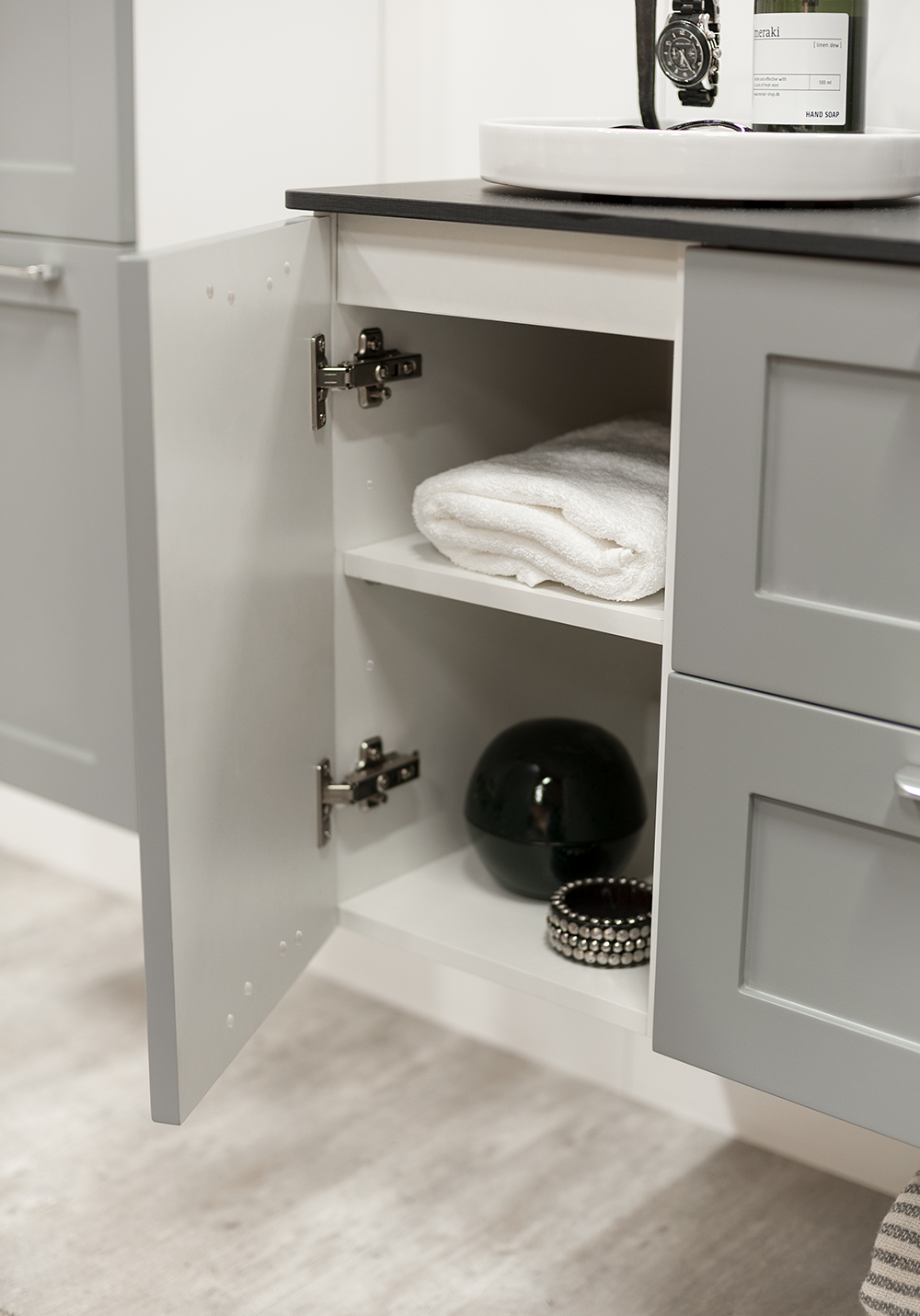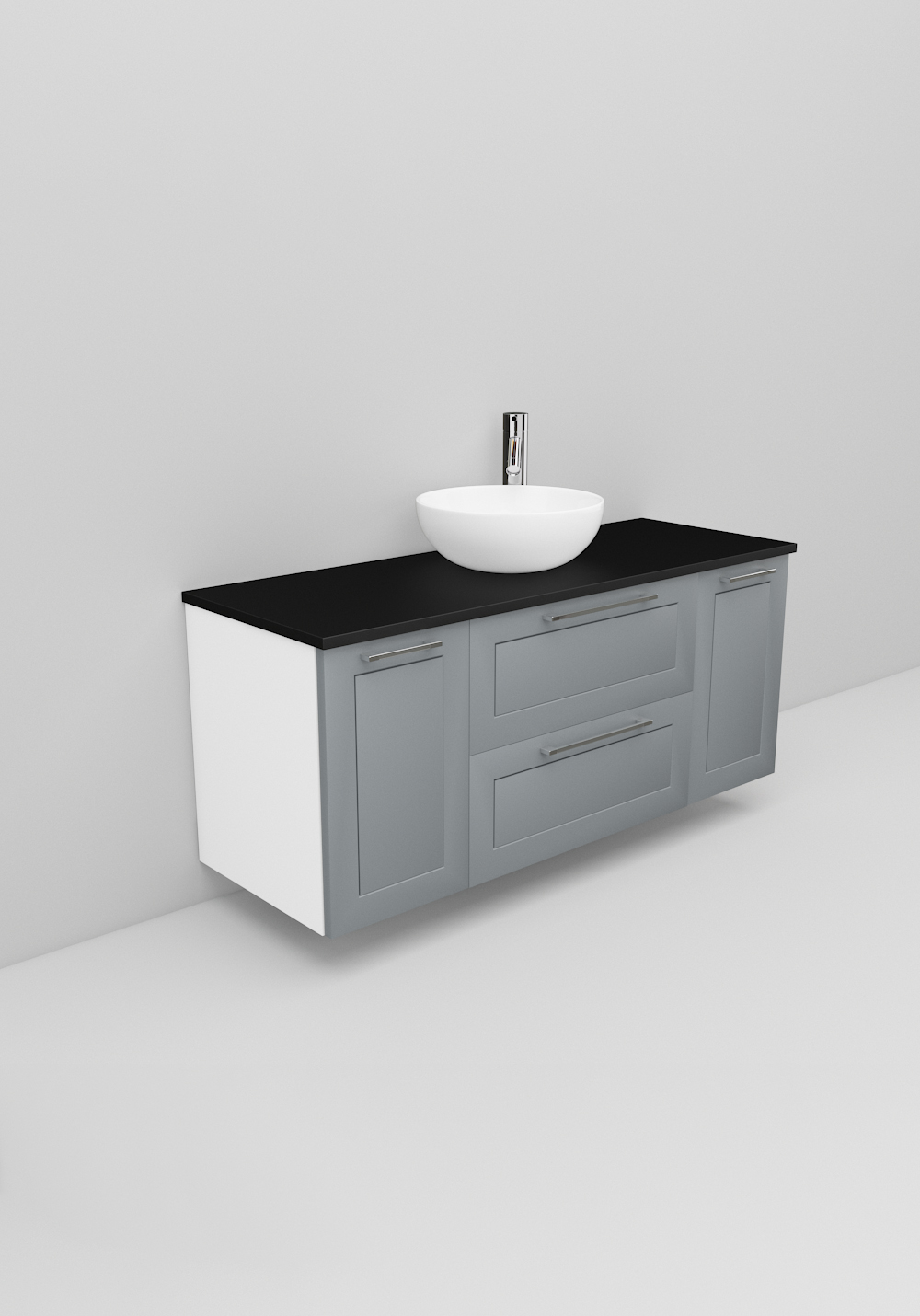 Flexline er badeværelsesmøbler med et tidløst design og mange muligheder. Møblerne fås i varianter med både låger og skuffer med Soft Close-funktion, i bredder på 600 og 1200 mm og med flere forskellige designs på fronterne, som giver karakter til dit møbel. Inkluderer en luksuriøs fritstående vask på en bordplade i Solid Surface-marmor eller sort bordplade. Håndtag, armatur, bundventil og vandlås købes separat.