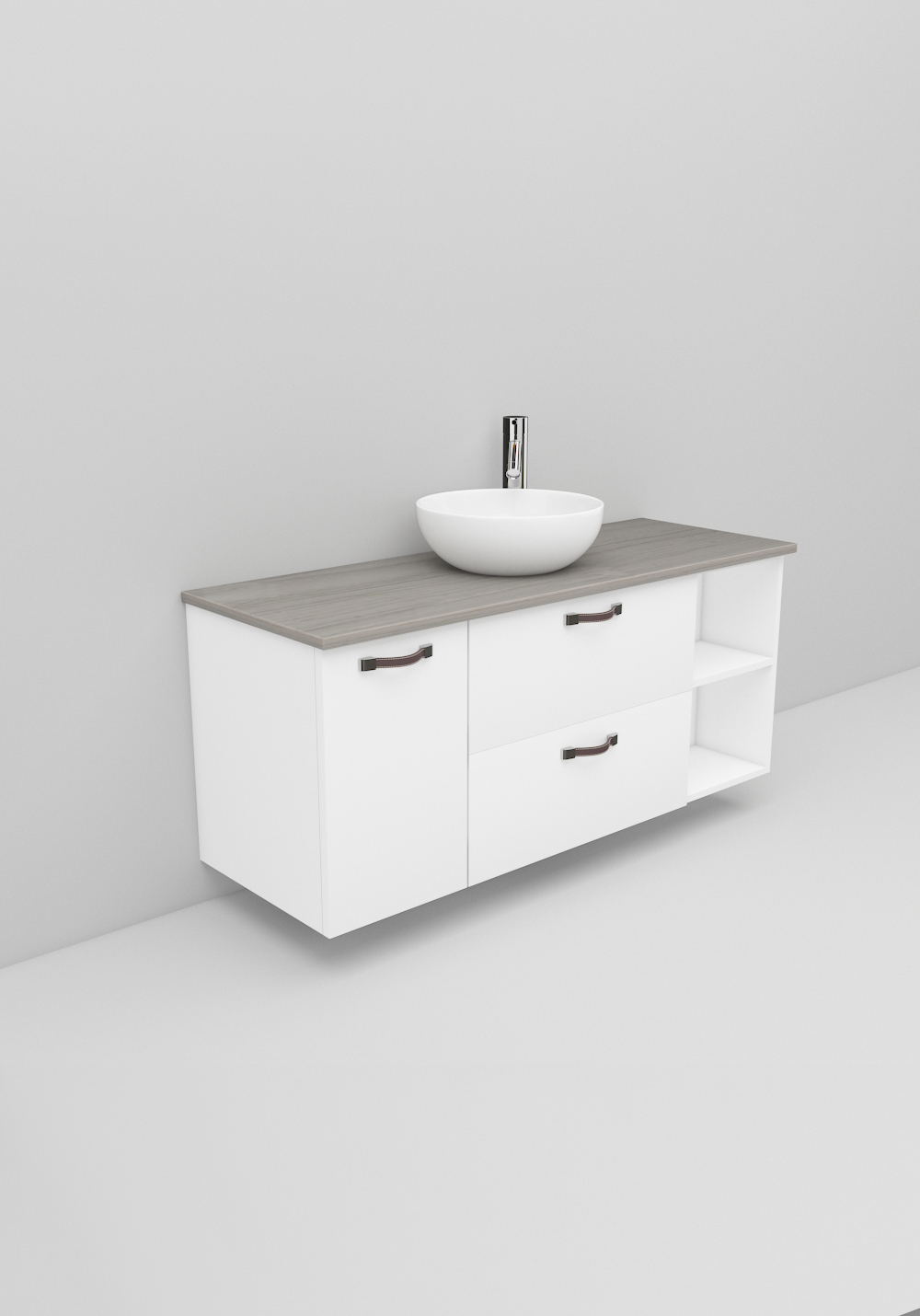 Flexline er badeværelsesmøbler med et tidløst design og mange muligheder. Møblerne fås i varianter med både låger og skuffer med Soft Close-funktion, i bredder på 600 og 1200 mm og med flere forskellige designs på fronterne, som giver karakter til dit møbel. Inkluderer en luksuriøs fritstående vask på en bordplade i Solid Surface-marmor eller sort bordplade. Håndtag, armatur, bundventil og vandlås købes separat.