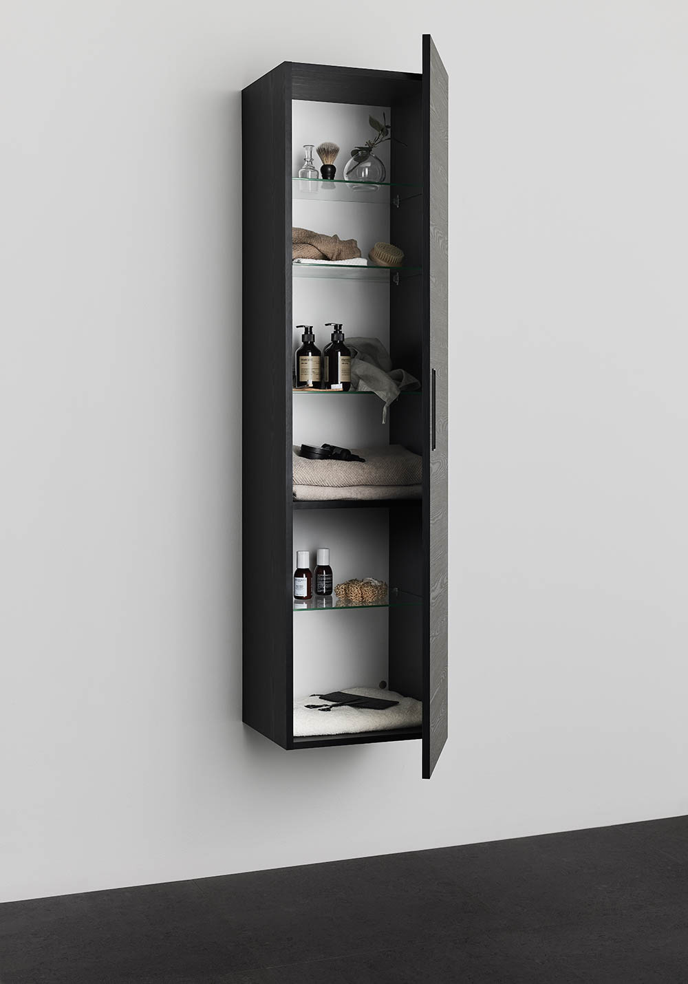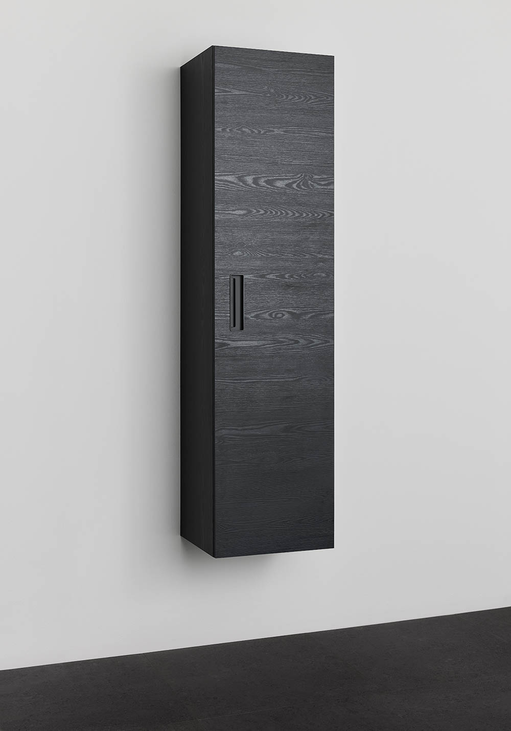 Noro Relounge højskab i moderne design giver dig mulighed for at skabe dit personlige badeværelse med integrerede greb. Højskabet er rummeligt og tilpasset til at have plads til håndklæder og andet der skal til på et badeværelse. Fås i sort træmønstret eller lakeret mat hvid overflade. Indvendigt er skabene hvide og har fire flytbare glashylder og en fast hylde i midten. Leveres samlet og du vælger selv om døren skal hænge i højre eller venstre side ved montering. Stikkontakt sælges separat.