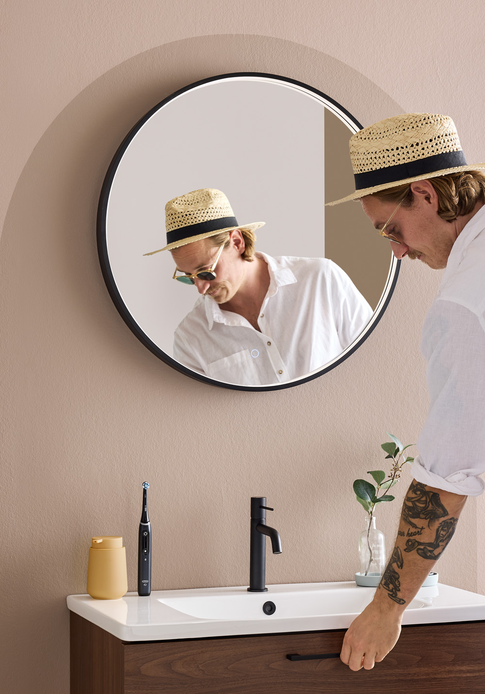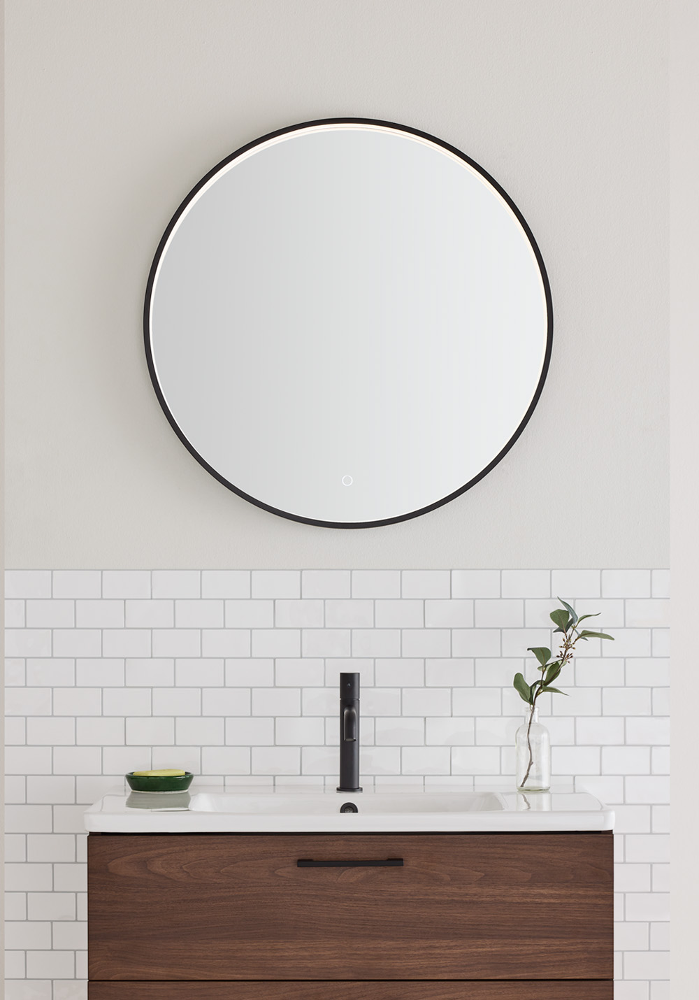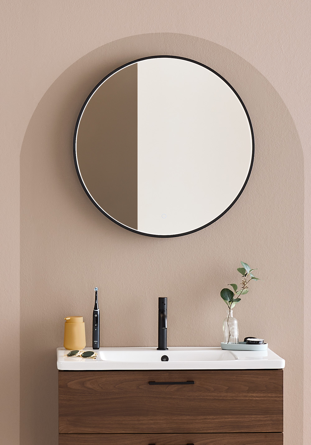 Noro Mood Round er et elegant spejl med sort ramme og integreret LED-belysning. Justerbar lystemperatur fra varmt til koldt lys via touchfunktion. IP44-klassificert til badeværelsemiljø.