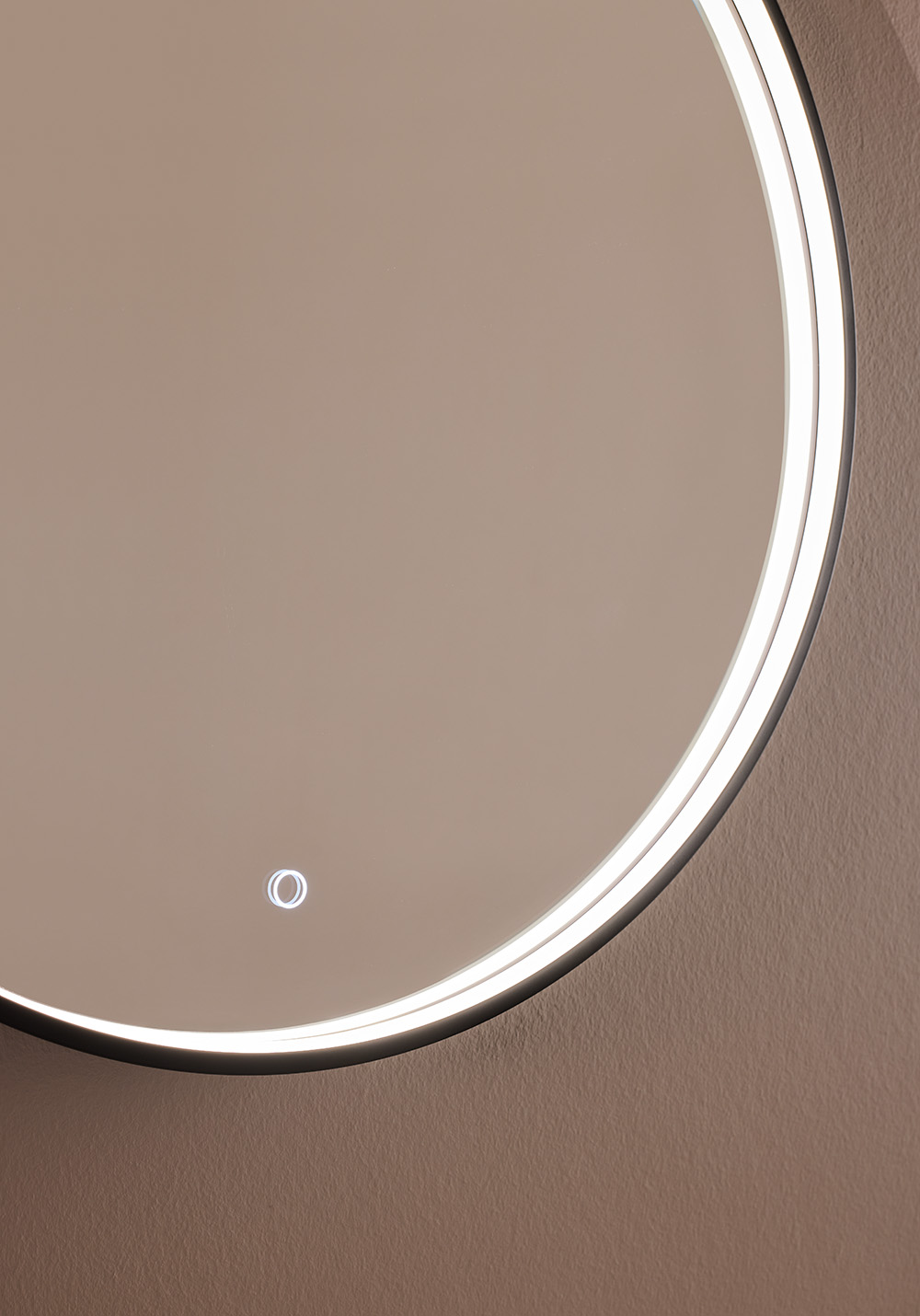 Mood-spejlet fra Noro er et rundt badværelsespejl med en diameter på 70 cm og integreret LED-belysning. Spejlet har en elegant sort ramme hele vejen rundt. Lyset giver et behageligt, indadrettet skær, som sikrer god ansigtsbelysning.