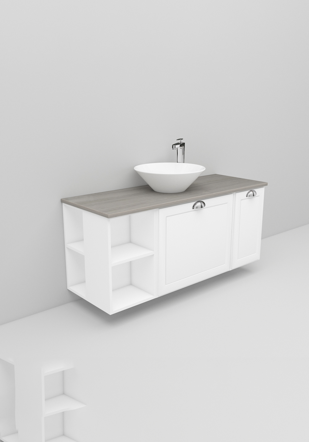 Flexline er badeværelsesmøbler med et tidløst design og mange muligheder. Møblerne fås i varianter med både låger og skuffer med Soft Close-funktion, i bredder på 600, 900 og 1200 mm og med flere forskellige designs på fronterne, som giver karakter til dit møbel. Inkluderer en luksuriøs fritstående vask på en bordplade i Solid Surface-marmor eller sort bordplade. Håndtag, armatur, bundventil og vandlås købes separat.