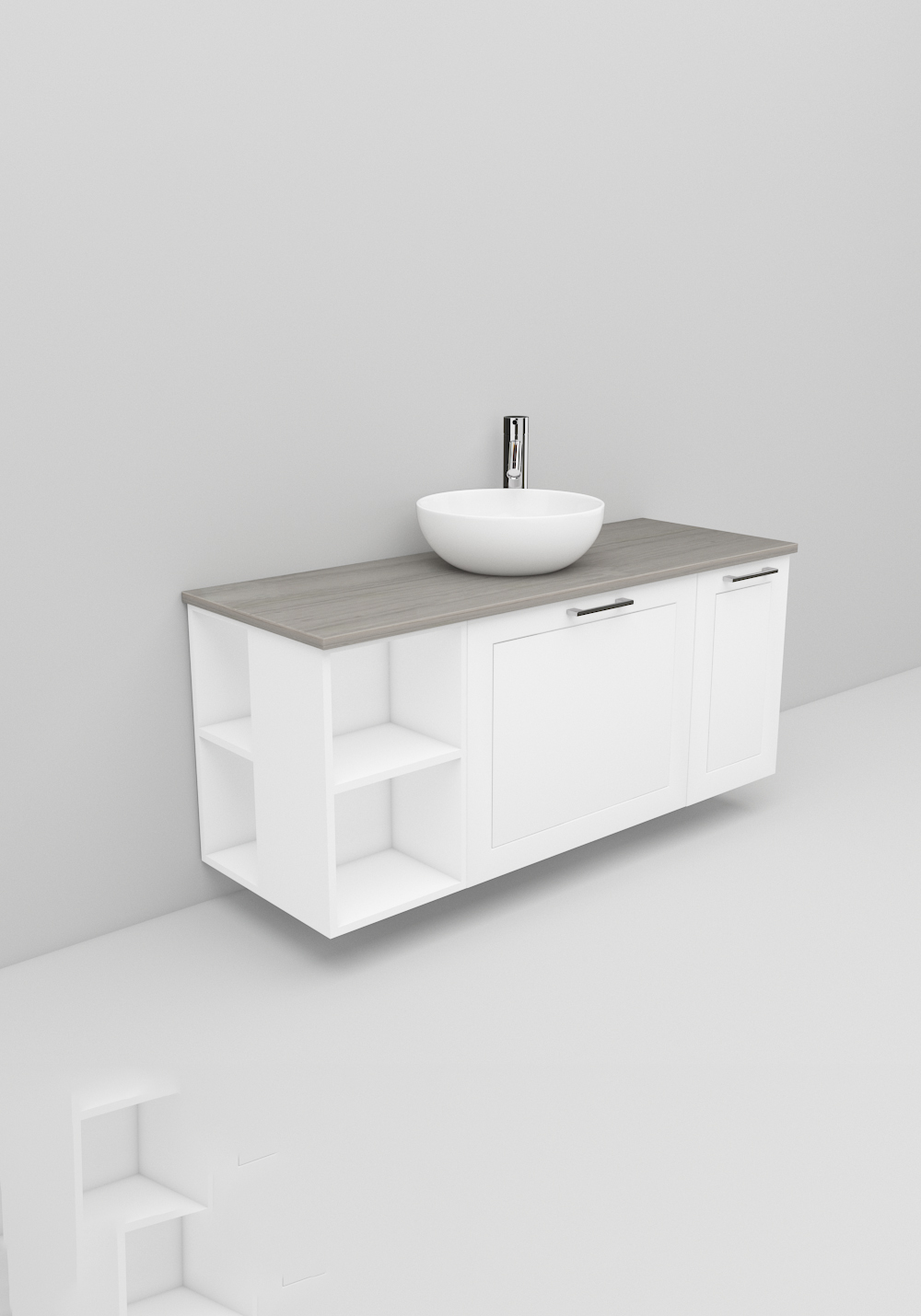 Flexline er badeværelsesmøbler med et tidløst design og mange muligheder. Møblerne fås i varianter med både låger og skuffer med Soft Close-funktion, i bredder på 600, 900 og 1200 mm og med flere forskellige designs på fronterne, som giver karakter til dit møbel. Inkluderer en luksuriøs fritstående vask på en bordplade i Solid Surface-marmor eller sort bordplade. Håndtag, armatur, bundventil og vandlås købes separat.