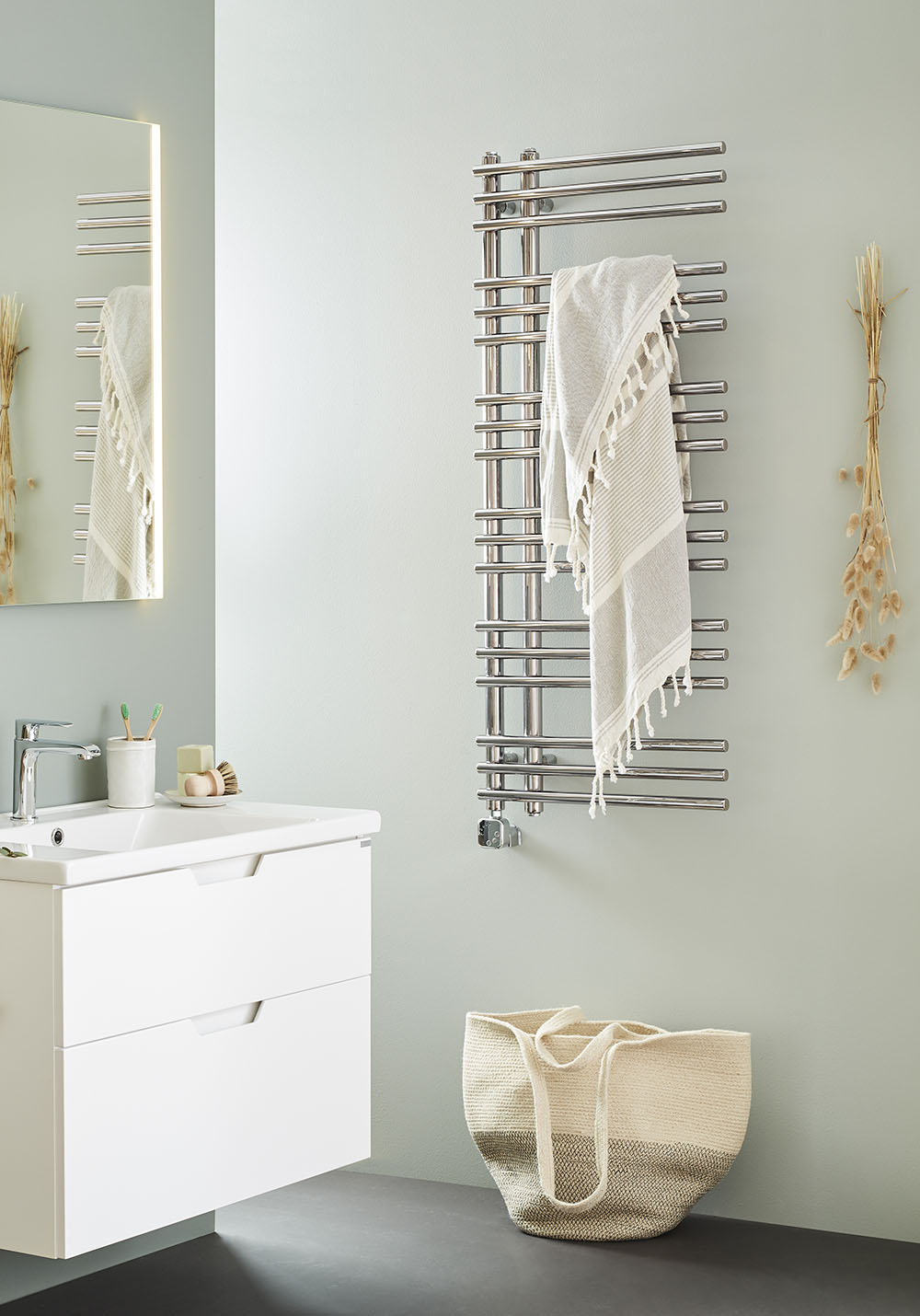 Vores håndklædetørrer Arc i pæn og praktisk, asymmetrisk form. Den asymmetriske udformning gør, at det er nemt at hænge håndklæderne op ved at føre dem ind fra siden eller ved at bruge rørenderne som krog. Håndklædetørreren kan placeres således, at de lodrette rør vender mod højre eller venstre. Ikke inkluderet: elpatron eller ethulsventil.